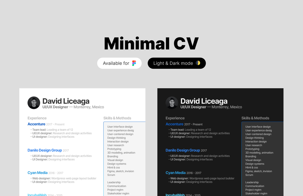 Minimal CV template for Figma in light and dark version. 🔗 With links working. ⚫️ using Inter font